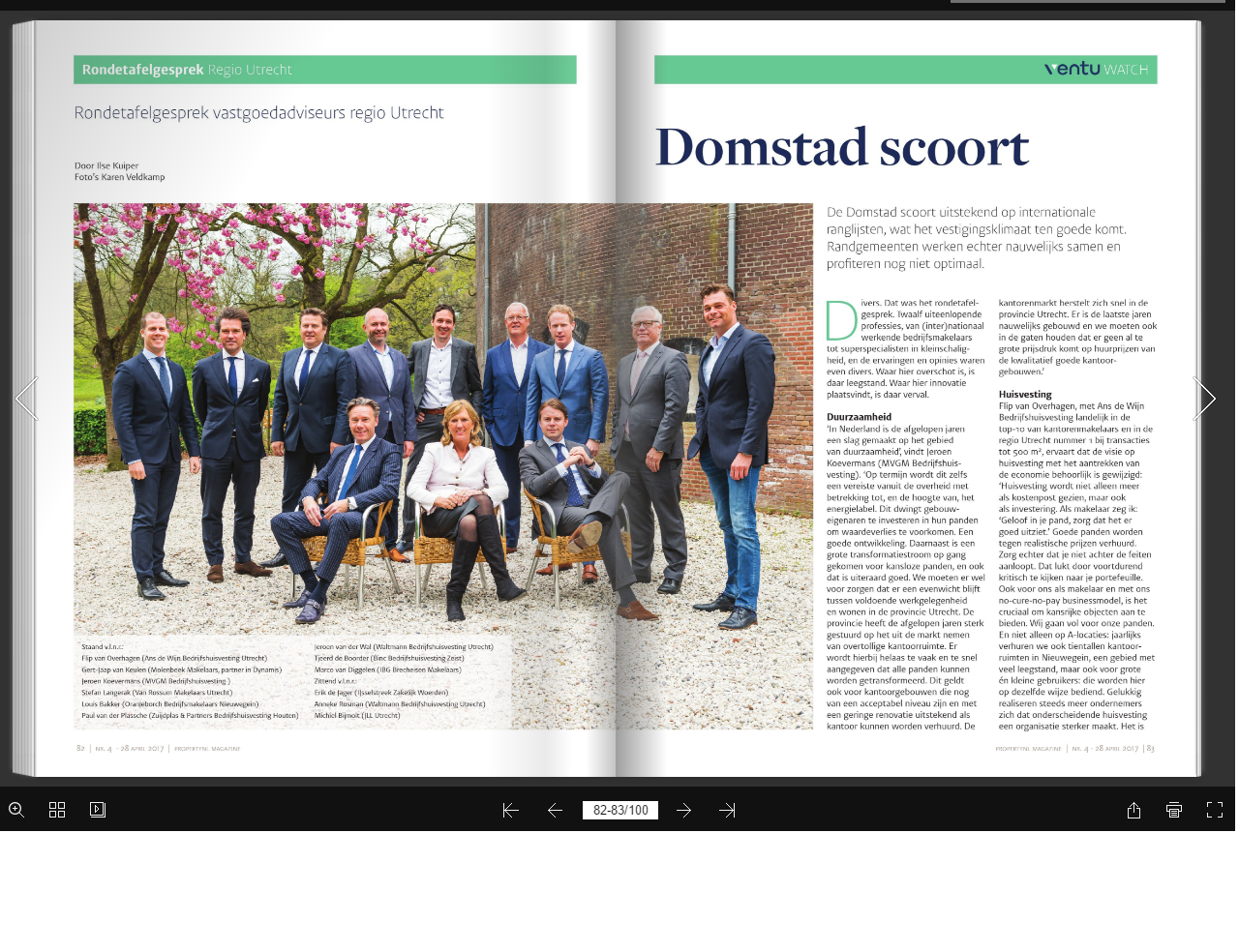 - Ventu (PropertyNL), Rondetafelgesprek ‘Domstad scoort’ met 12 commercieel vastgoedadviseurs en ontwikkelaars, vastgoedmarkt Utrecht, pagina 82-83, 84-85 en 86-87.